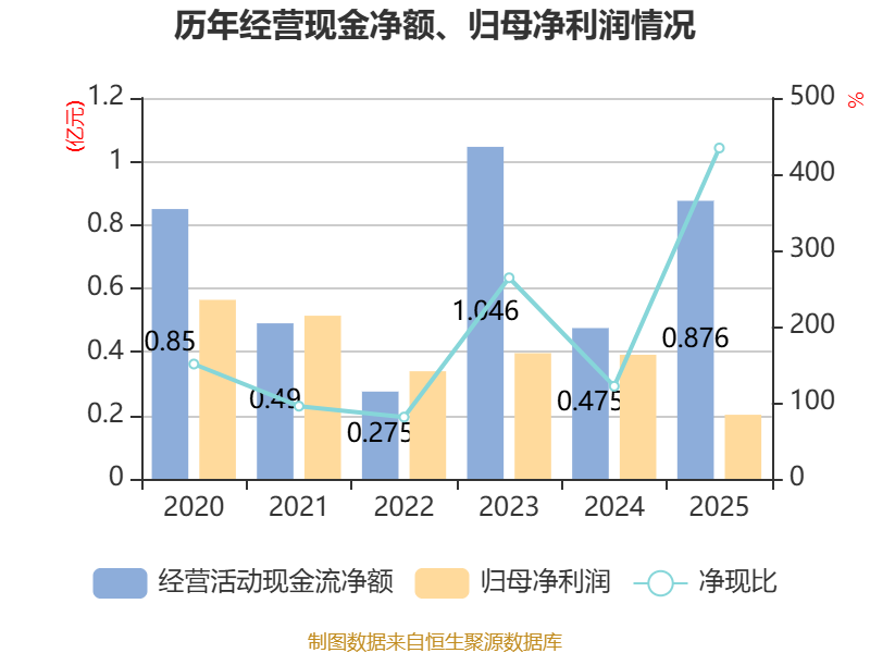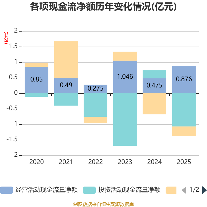 截至2025年,公司经营活动现金流净额为8755.56万元,同比增长84.27%;筹资活动现金流净额-3156.33万元,同比增加3685.87万元;投资活动现金流净额-1.07亿元,上年同期为2607.5万元。