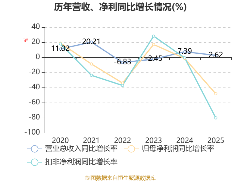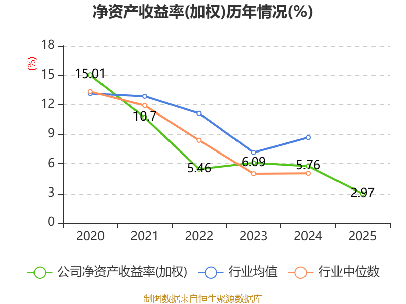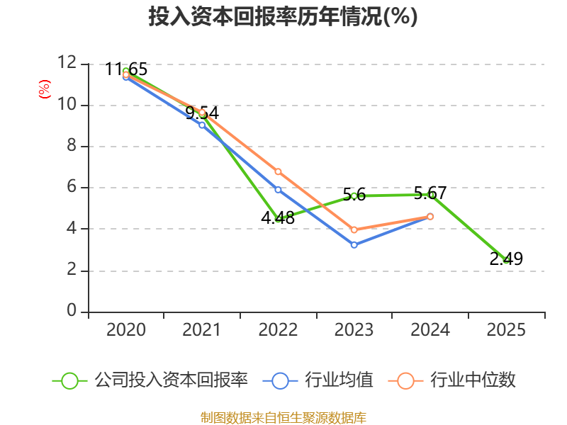 数据显示,2025年公司加权平均净资产收益率为2.97%,较上年同期下降2.79个百分点。公司2025年投入资本回报率为2.49%,较上年同期下降3.18个百分点。