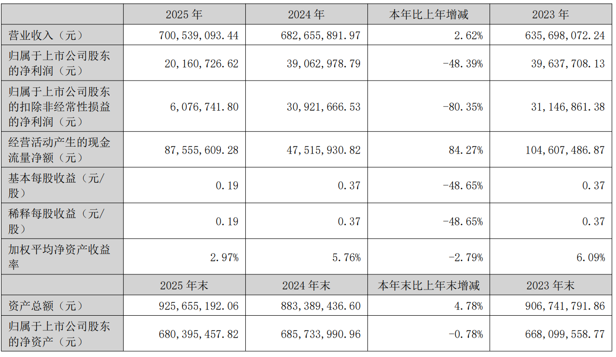 中证智能财讯金百泽(301041)4月21日披露2025年年度报告。2025年,公司实现营业总收入7.01亿元,同比增长2.62%;归母净利润2016.07万元,同比下降48.39%;扣非净利润607.67万元,同比下降80.35%;经营活动产生的现金流量净额为8755.56万元,同比增长84.27%;报告期内,金百泽基本每股收益为0.19元,加权平均净资产收益率为2.97%。公司2025年度分配预案为:拟向全体股东每10股派现0.48元(含税)。