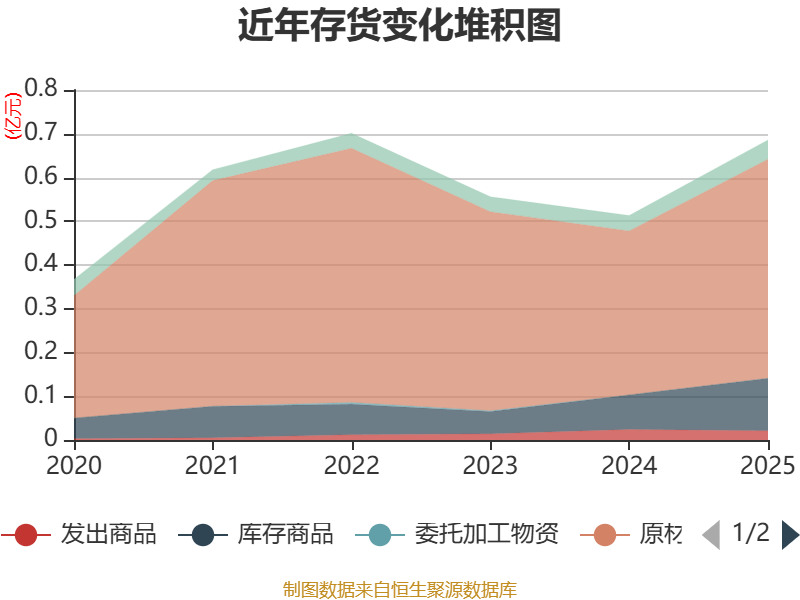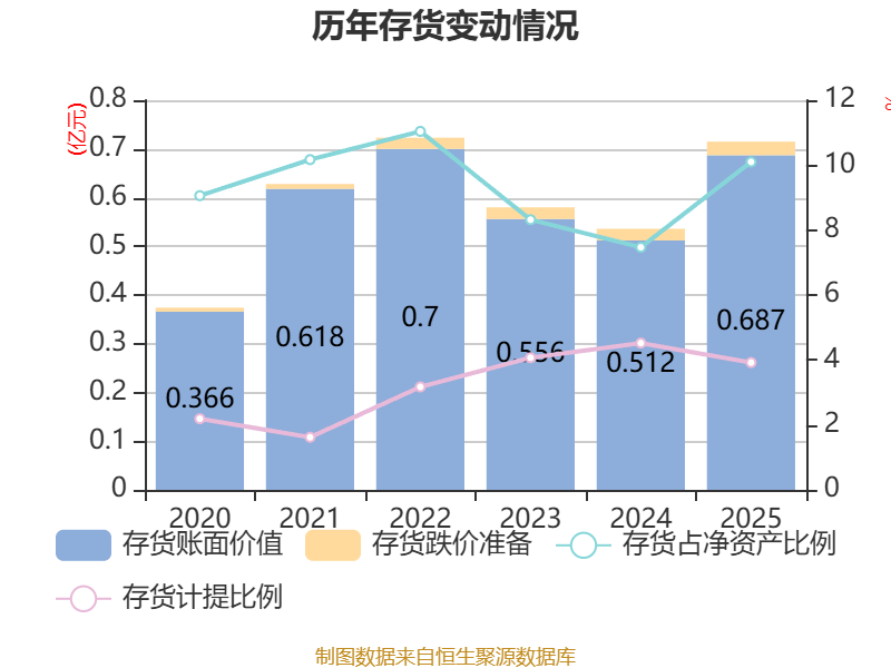 从存货变动来看,截至2025年末,公司存货账面价值为6870.78万元,占净资产的10.1%,较上年末增加1747.47万元。其中,存货跌价准备为280.29万元,计提比例为3.92%。