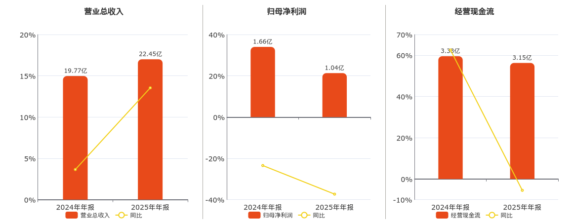 公司营业总收入为22.45亿元。归母净利润为1.04亿元,较去年同报告期归母净利润减少5798.57万元,同比较去年同期下降35.82%。经营活动现金净流入为3.15亿元,较去年同报告期经营活动现金净流入减少1657.95万元,同比较去年同期下降5.00%。