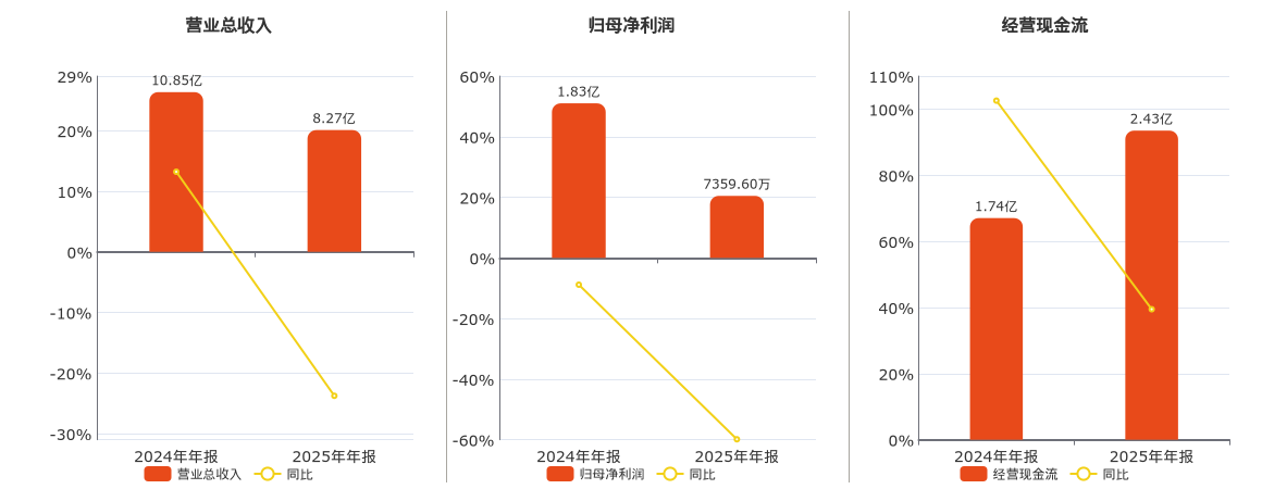 公司营业总收入为8.27亿元,较去年同报告期营业总收入减少2.58亿元,同比较去年同期下降23.76%。归母净利润为7359.60万元,较去年同报告期归母净利润减少1.10亿元,同比较去年同期下降59.86%。经营活动现金净流入为2.43亿元。