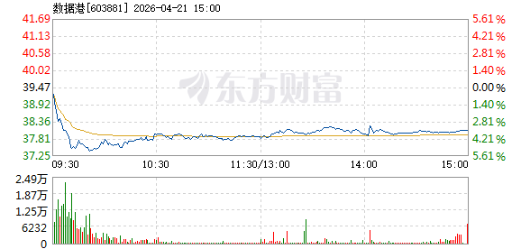 4月21日,数据港盘中加速下跌,5分钟内跌幅超过2%,截至9点35分,报38.21元,成交3.03亿元,换手率1.09%。