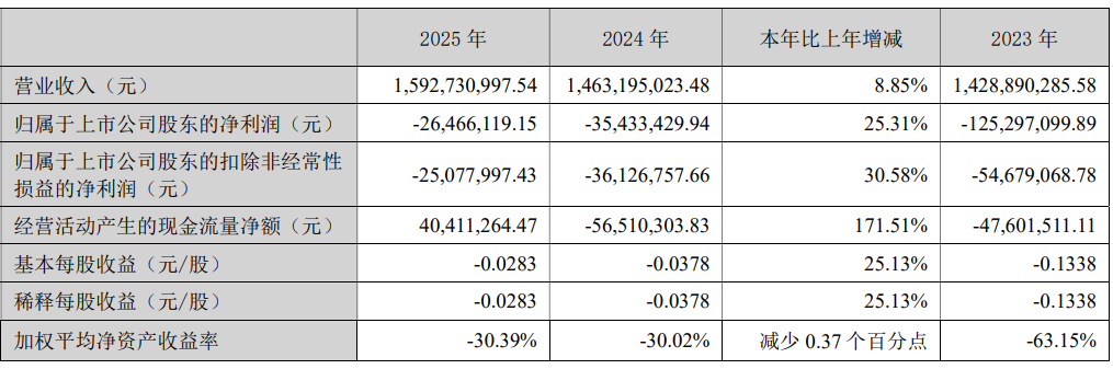 中证智能财讯中嘉博创(000889)4月21日披露2025年年度报告。2025年,公司实现营业总收入15.93亿元,同比增长8.85%;归母净利润亏损2646.61万元,上年同期亏损3543.34万元;扣非净利润亏损2507.8万元,上年同期亏损3612.68万元;经营活动产生的现金流量净额为4041.13万元,上年同期为-5651.03万元;报告期内,中嘉博创基本每股收益为-0.0283元,加权平均净资产收益率为-30.39%。