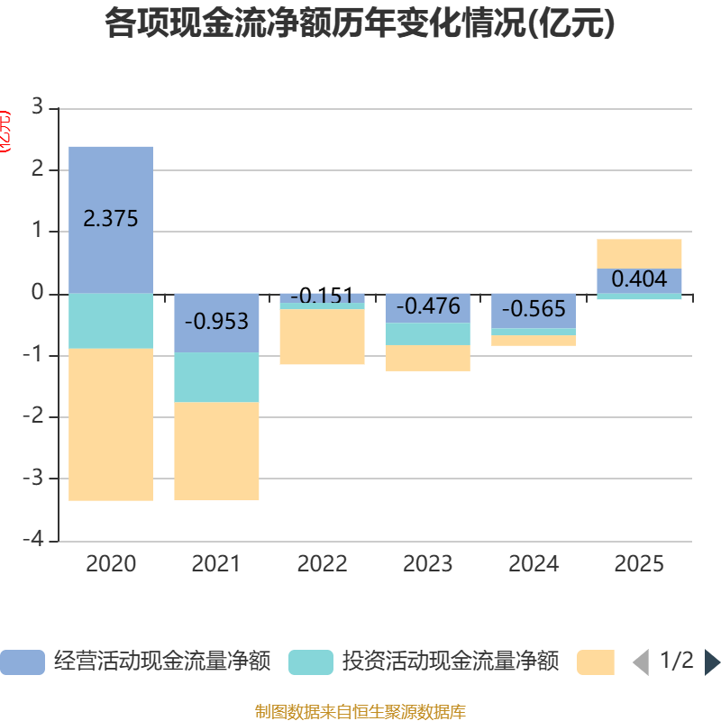 截至2025年,公司经营活动现金流净额为4041.13万元,同比增加9692.16万元;筹资活动现金流净额4759.06万元,同比增加6468.04万元;投资活动现金流净额-937.59万元,上年同期为-1106.38万元。