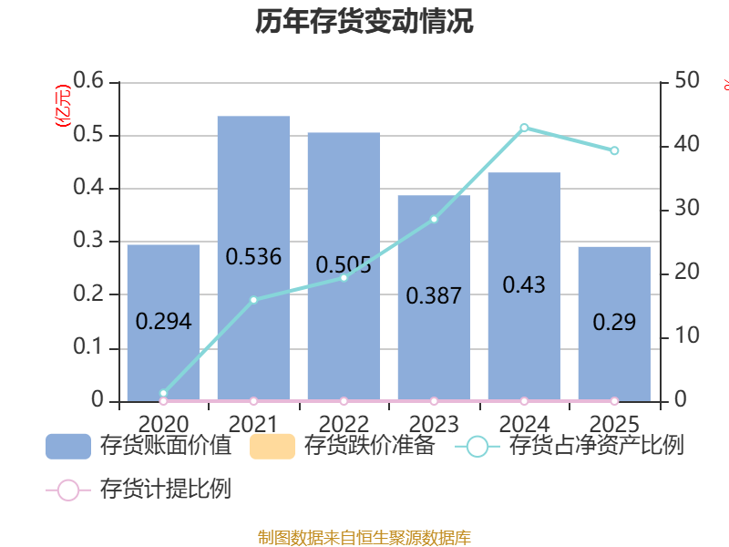 从存货变动来看,截至2025年末,公司存货账面价值为2898.87万元,占净资产的39.25%,较上年末减少1399.82万元。公司本期没有计提存货跌价准备。