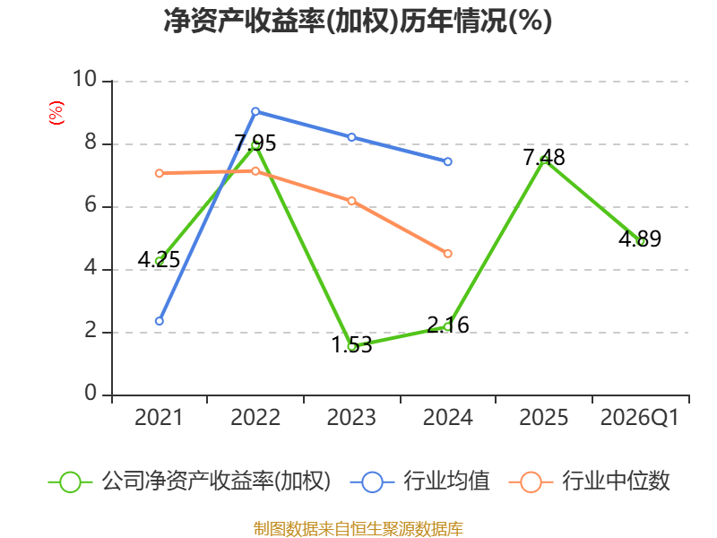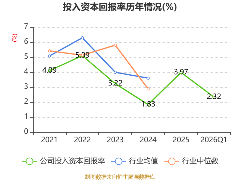 盈利能力方面, 2026年一季度公司加权平均净资产收益率为4.89%,同比下降4.07个百分点。公司2026年第一季度投入资本回报率为2.32%,较上年同期下降1.98个百分点。