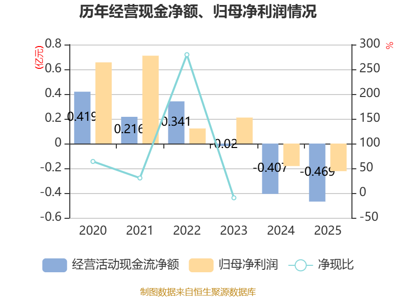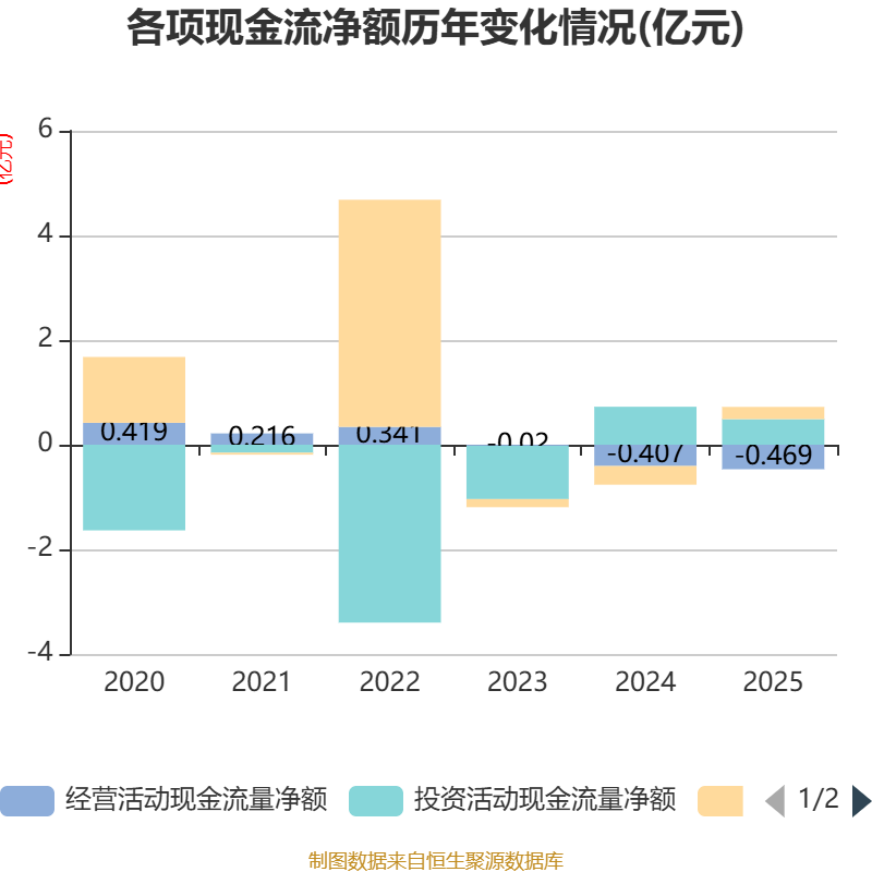 截至2025年,公司经营活动现金流净额为-4693.49万元,同比减少620.01万元;筹资活动现金流净额2338.4万元,同比增加5903.55万元;投资活动现金流净额4888.15万元,上年同期为7263.16万元。