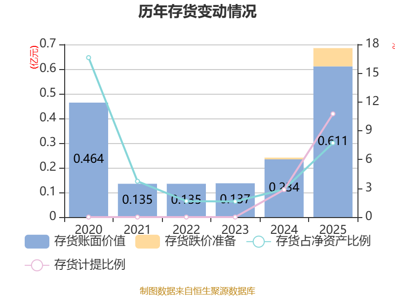 从存货变动来看,截至2025年末,公司存货账面价值为6109.85万元,占净资产的7.72%,较上年末增加3773.9万元。其中,存货跌价准备为736.95万元,计提比例为10.76%。