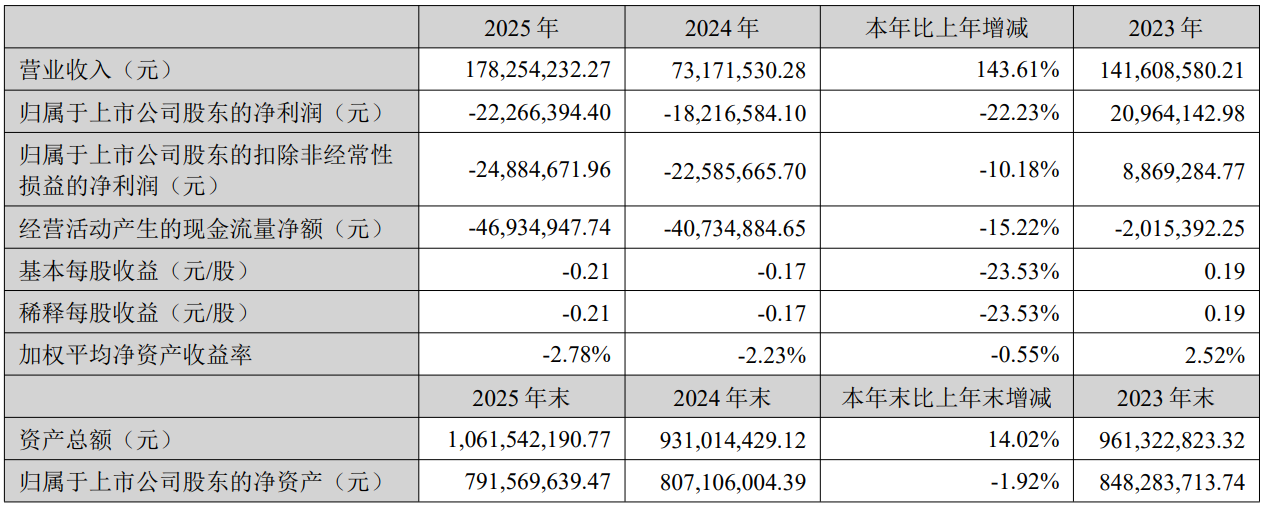 中证智能财讯 *ST清研(301288)4月21日披露2025年年度报告。2025年,公司实现营业总收入1.78亿元,同比增长143.61%;归母净利润亏损2226.64万元,上年同期亏损1821.66万元;扣非净利润亏损2488.47万元,上年同期亏损2258.57万元;经营活动产生的现金流量净额为-4693.49万元,上年同期为-4073.49万元;报告期内,*ST清研基本每股收益为-0.21元,加权平均净资产收益率为-2.78%。