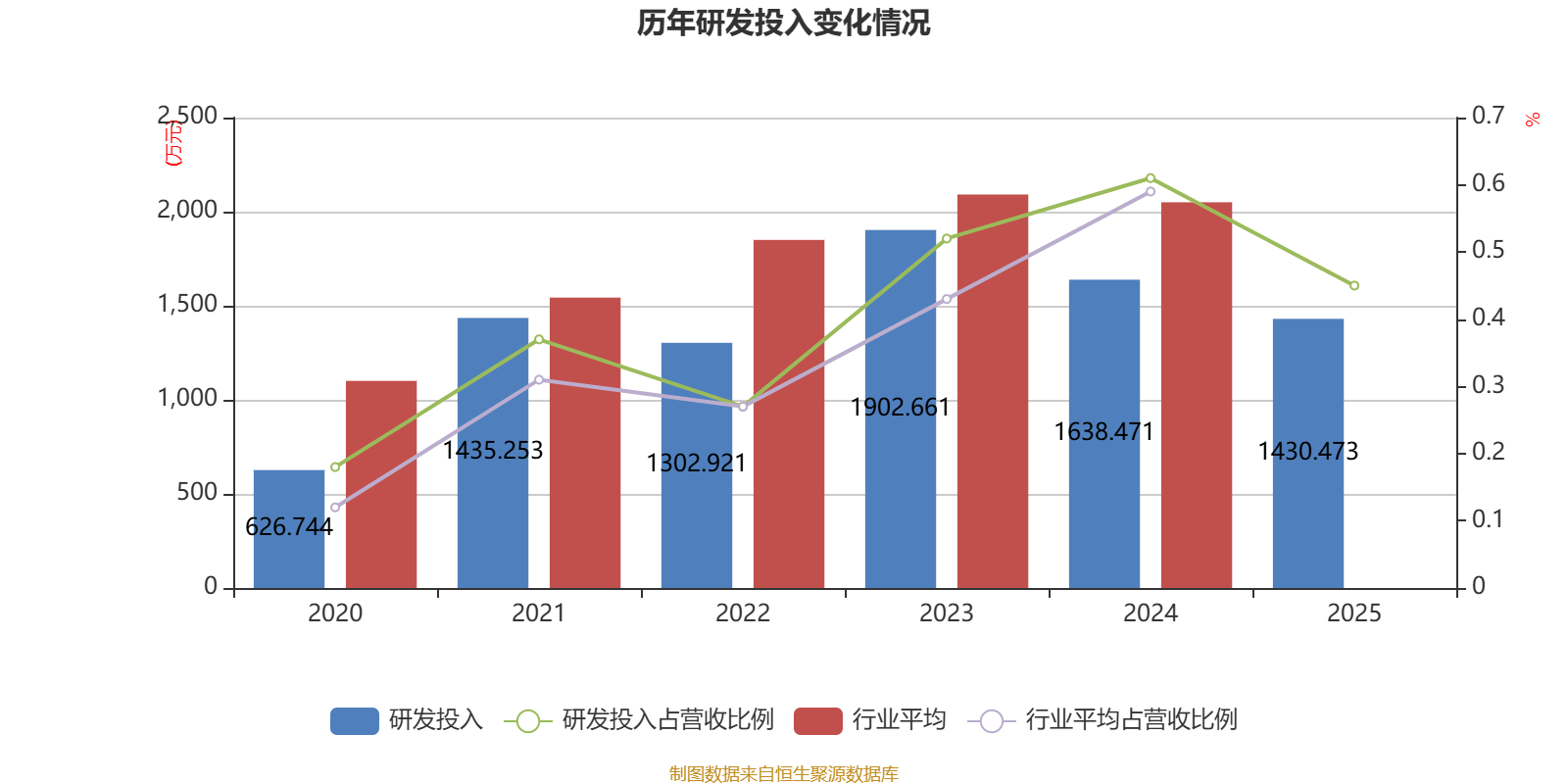 2025年全年,公司研发投入金额为1430.47万元,同比下降12.69%;研发投入占营业收入比例为0.45%,相比上年同期下降0.16个百分点。此外,公司全年研发投入资本化率为0%。