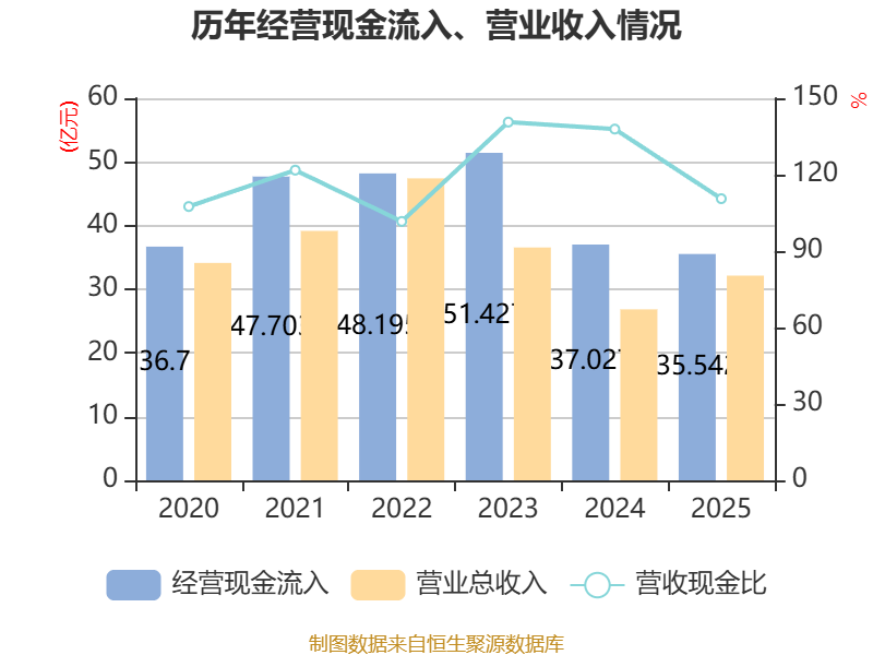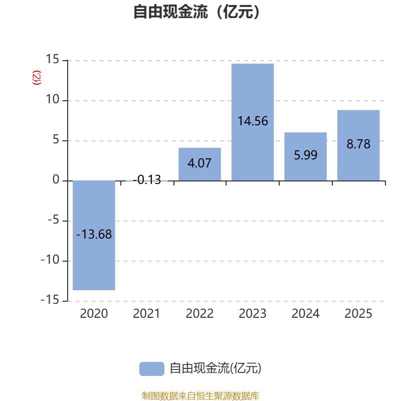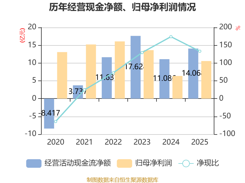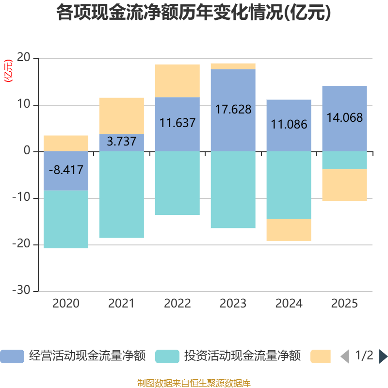 截至2025年,公司经营活动现金流净额为14.07亿元,同比增长26.89%;筹资活动现金流净额-6.77亿元,同比减少2.01亿元;投资活动现金流净额-3.86亿元,上年同期为-14.5亿元。
