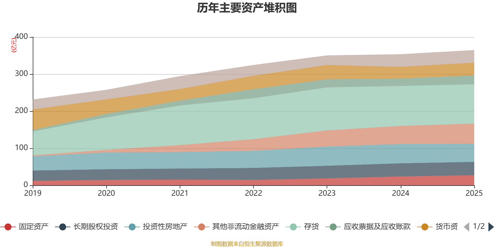 资产重大变化方面,截至2025年末,公司投资性房地产较上年末减少6.93%,占公司总资产比重下降1.45个百分点;存货较上年末减少1.53%,占公司总资产比重下降1.39个百分点;其他非流动金融资产较上年末增加12.29%,占公司总资产比重上升1.22个百分点;长期应收款较上年末减少22.25%,占公司总资产比重下降1.09个百分点。