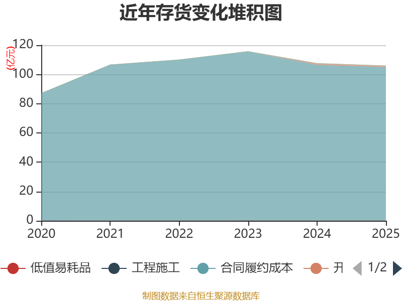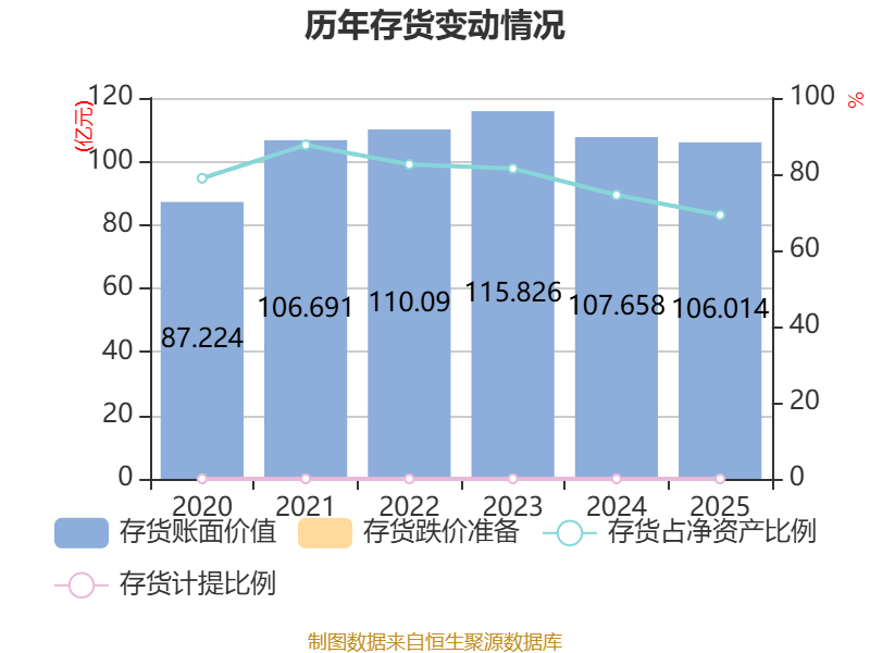 从存货变动来看,截至2025年末,公司存货账面价值为106.01亿元,占净资产的69.26%,较上年末减少1.64亿元。公司本期没有计提存货跌价准备。