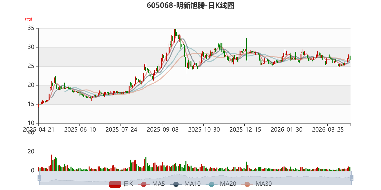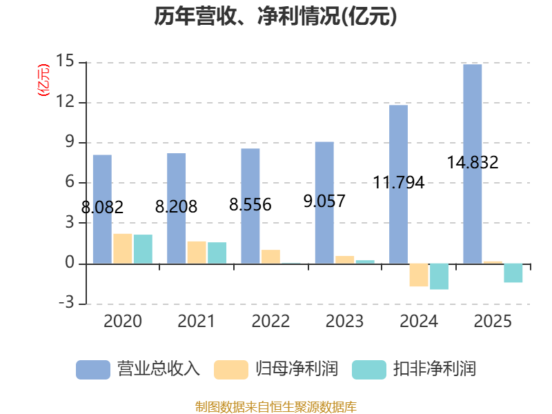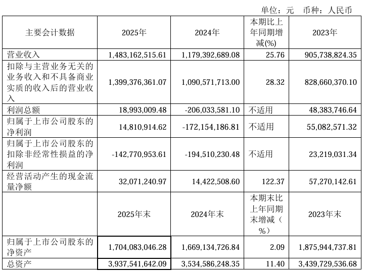中证智能财讯明新旭腾(605068)4月21日披露2025年年度报告。2025年,公司实现营业总收入14.83亿元,同比增长25.76%;归母净利润1481.09万元,同比扭亏;扣非净利润亏损1.43亿元,上年同期亏损1.95亿元;经营活动产生的现金流量净额为3207.12万元,同比增长122.37%;报告期内,明新旭腾基本每股收益为0.09元,加权平均净资产收益率为0.88%。公司2025年度分配预案为:拟向全体股东每10股派现0.4元(含税)。