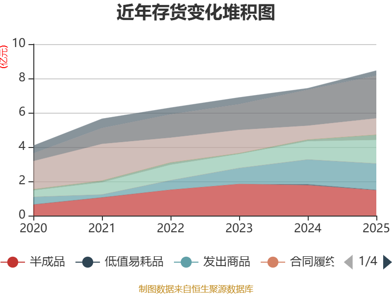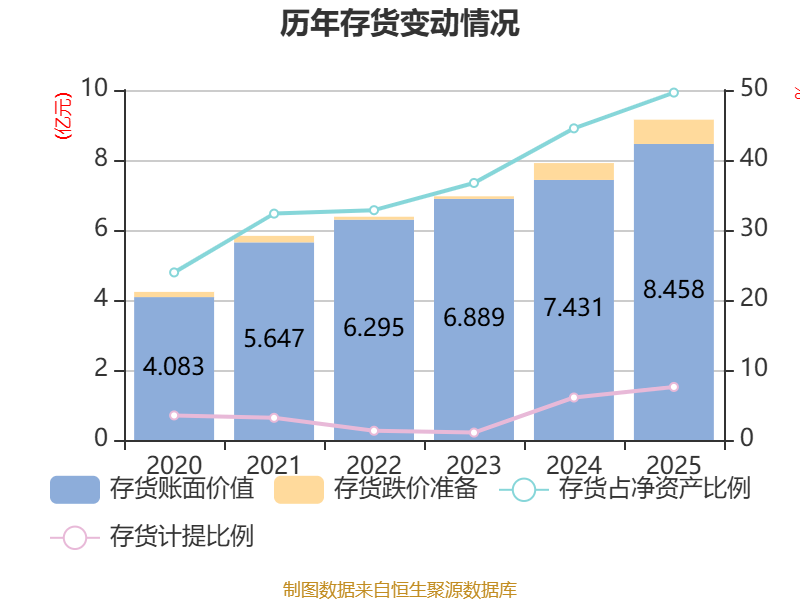 从存货变动来看,截至2025年末,公司存货账面价值为8.46亿元,占净资产的49.63%,较上年末增加1.03亿元。其中,存货跌价准备为6940.4万元,计提比例为7.58%。