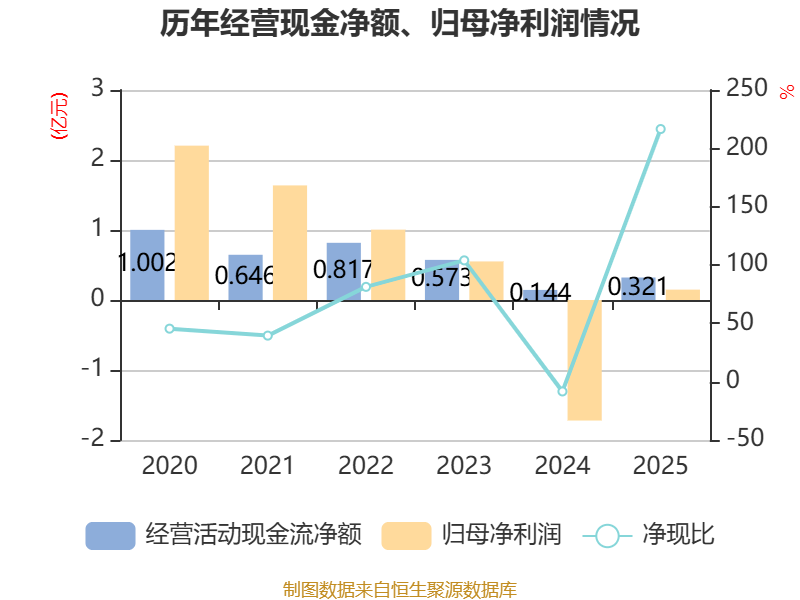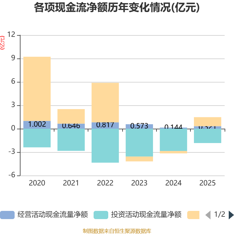 截至2025年,公司经营活动现金流净额为3207.12万元,同比增长122.37%;筹资活动现金流净额1.16亿元,同比增加1.47亿元;投资活动现金流净额-1.84亿元,上年同期为-2.85亿元。