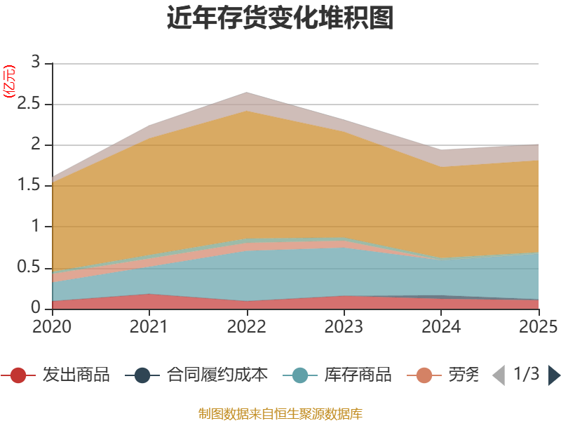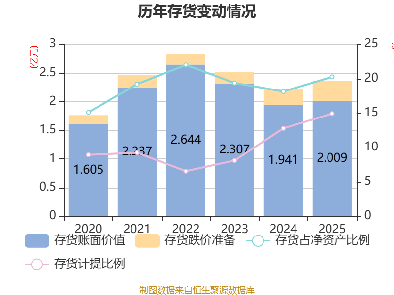 从存货变动来看,截至2025年末,公司存货账面价值为2.01亿元,占净资产的20.26%,较上年末增加678.4万元。其中,存货跌价准备为3523.51万元,计提比例为14.92%。