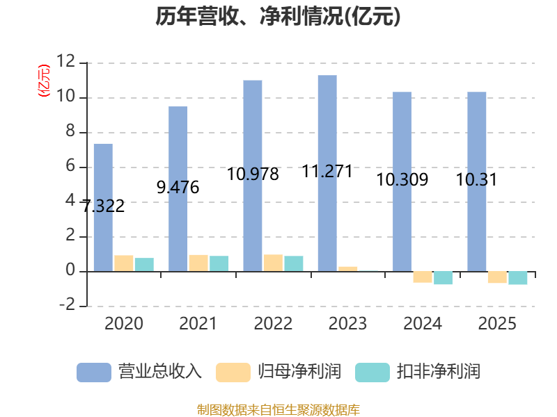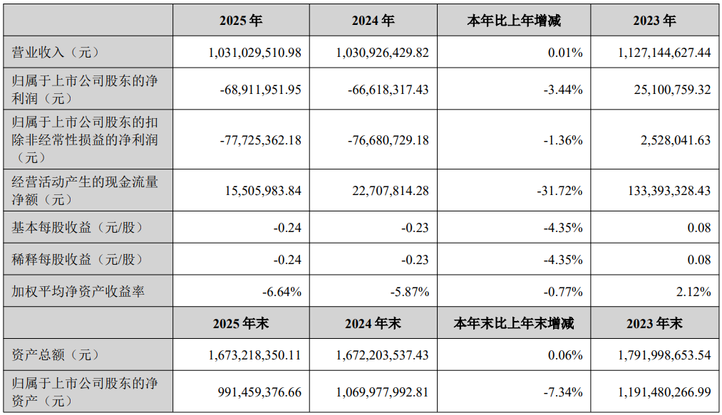 中证智能财讯万讯自控(300112)4月21日披露2025年年度报告。2025年,公司实现营业总收入10.31亿元,同比增长0.01%;归母净利润亏损6891.2万元,上年同期亏损6661.83万元;扣非净利润亏损7772.54万元,上年同期亏损7668.07万元;经营活动产生的现金流量净额为1550.6万元,同比下降31.72%;报告期内,万讯自控基本每股收益为-0.24元,加权平均净资产收益率为-6.64%。