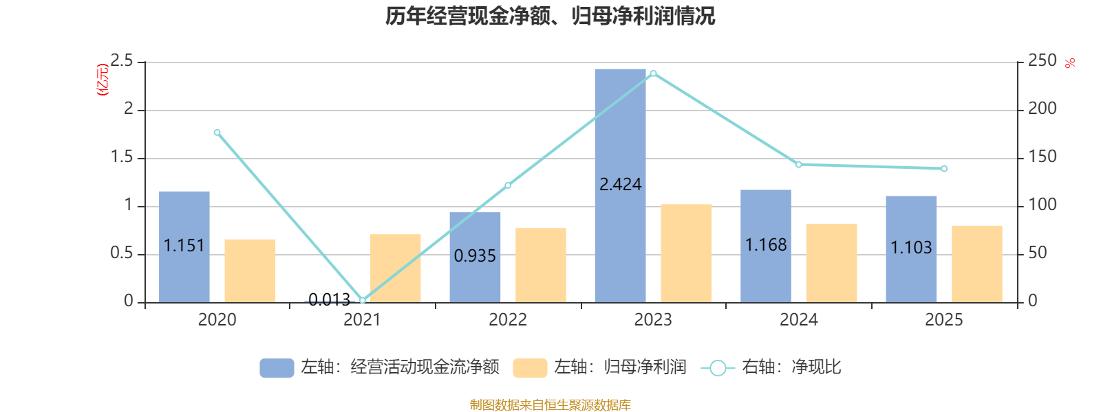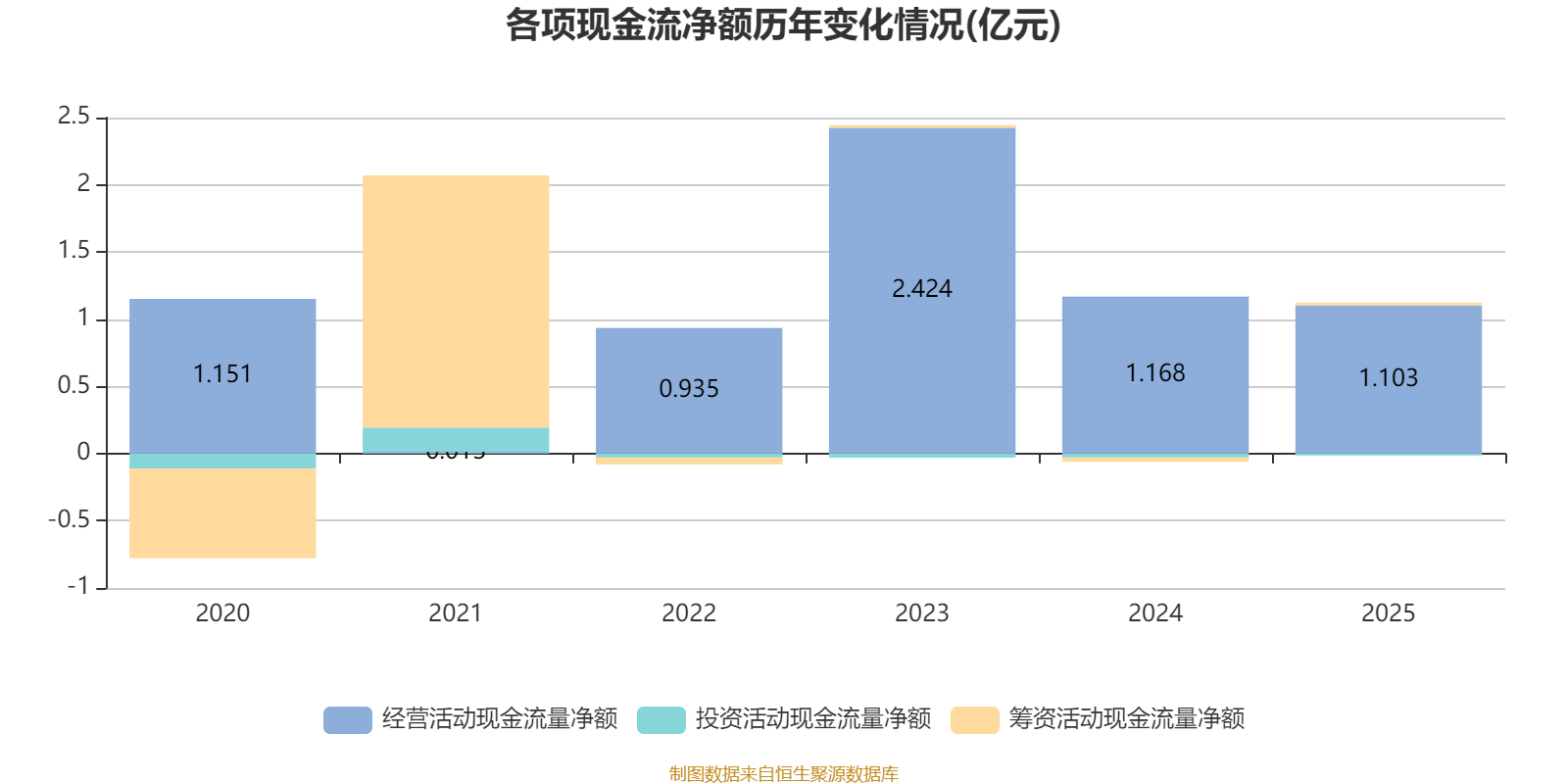 2025年,公司经营活动现金流净额为1.1亿元,同比下降5.55%;筹资活动现金流净额201.2万元,同比增加525.2万元;投资活动现金流净额-138.4万元,上年同期为-292.4万元。