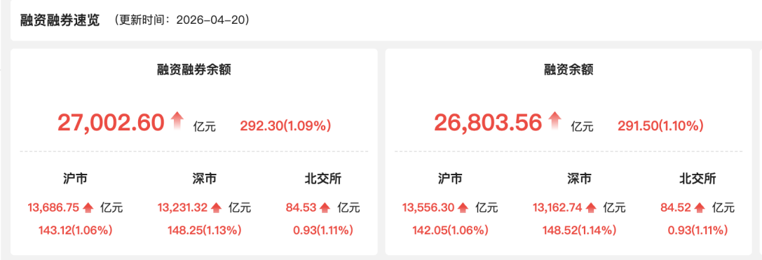 上证报中国证券网讯(记者徐蔚)4月20日,A股两融余额为27002.60亿元,较上一交易日增加292.30亿元,占A股流通市值比例为2.58%。当日两融交易额为2708.84亿元,较上一交易日增加223.10亿元,占A股成交额的10.38%。