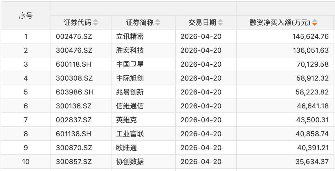个股方面,79只股获融资净买入额超1亿元。立讯精密获融资净买入额居首,净买入14.56亿元;融资净买入金额居前的还有胜宏科技、中国卫星、中际旭创、兆易创新、信维通信、英维克、工业富联、欧陆通、协创数据等。