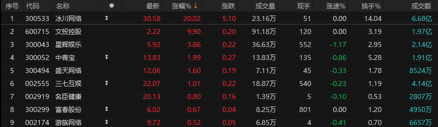 游戏板块逆势拉升,冰川网络“20cm”涨停,文投控股涨停,星辉娱乐、中青宝、盛天网络等跟涨。