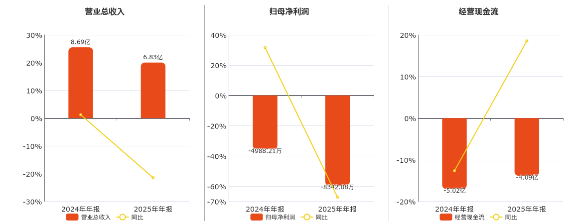 公司营业总收入为6.83亿元,在已披露的同业公司中排名第8,较去年同报告期营业总收入减少1.87亿元,同比较去年同期下降21.48%。归母净利润为-8342.08万元,在已披露的同业公司中排名第8,较去年同报告期归母净利润减少3353.87万元。经营活动现金净流入为-4.09亿元,在已披露的同业公司中排名第9。