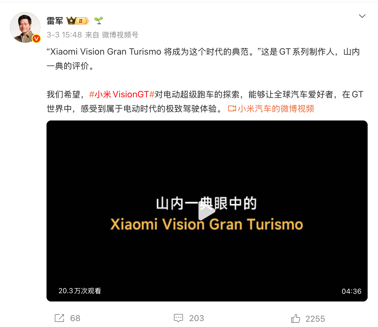 小米创始人雷军发文表示,“我们希望,小米VisionGT对电动超级跑车的探索,能够让全球汽车爱好者,在GT世界中,感受到属于电动时代的极致驾驶体验。”