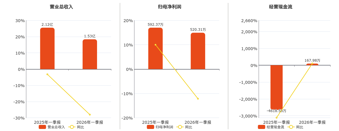 公司营业总收入为1.53亿元,较去年同报告期营业总收入减少5954.07万元,同比较去年同期下降28.05%。归母净利润为520.31万元,较去年同报告期归母净利润减少72.05万元,同比较去年同期下降12.16%。经营活动现金净流入为167.98万元。