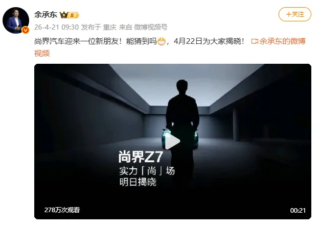 4月21日,余承东通过社交平台发布代言人预热视频:尚界汽车迎来一位新朋友!能猜到吗,4月22日为大家揭晓!