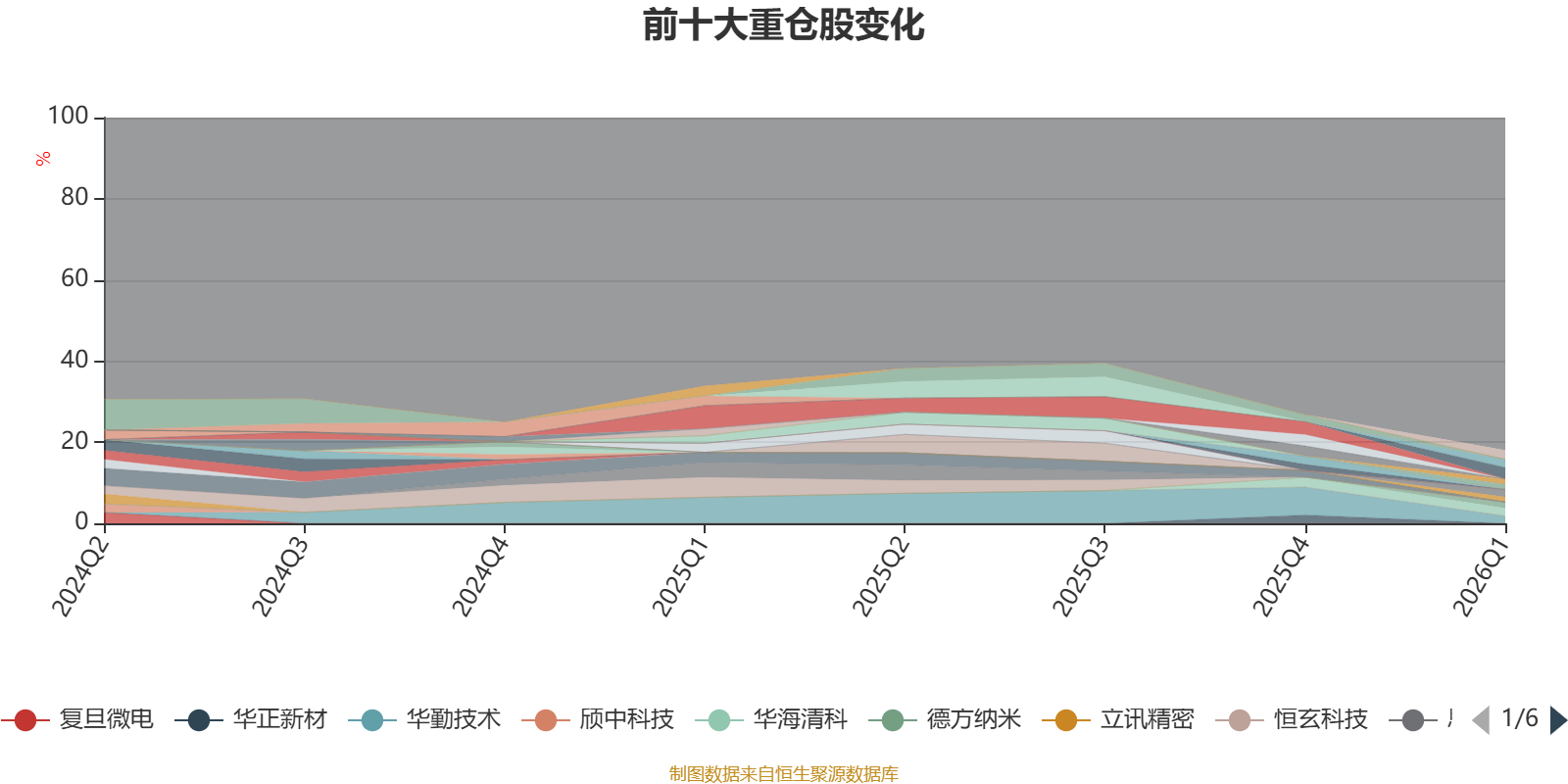 截至2026年一季度末,基金十大重仓股分别是纳芯微、恩捷股份、思瑞浦、华海清科、长电科技、华勤技术、德方纳米、鼎胜新材、中巨芯、东威科技。