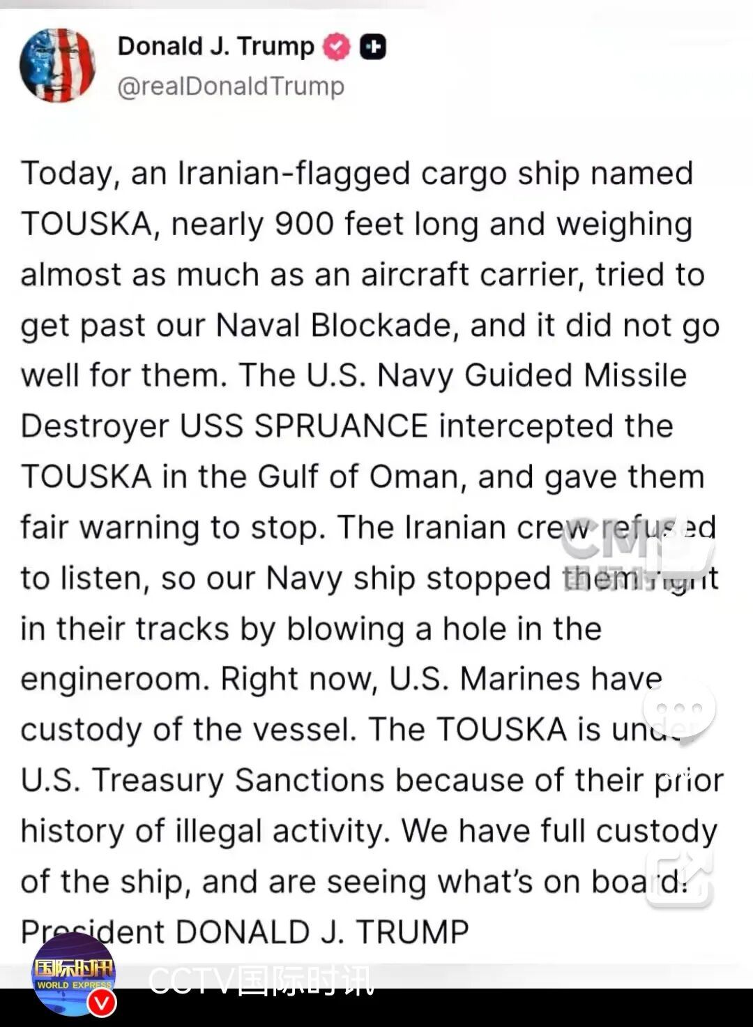 特朗普称,“TOUSKA”号货船受到美国财政部制裁。美军“已经完全控制这艘船,并正在检查船上货品”。