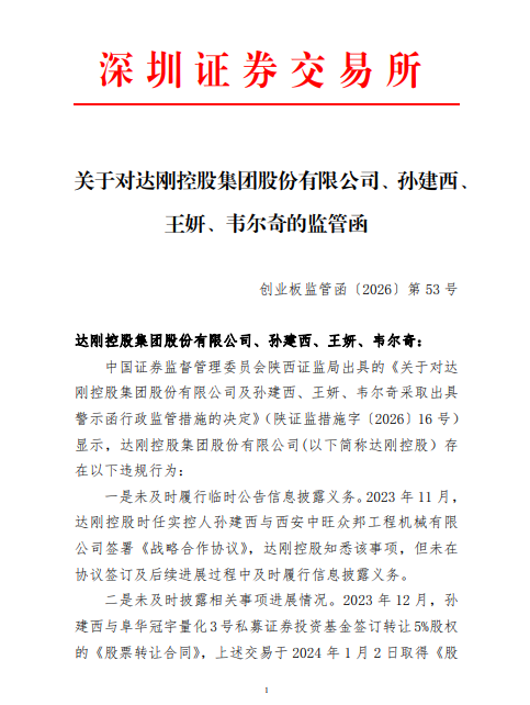 据深交所4月20日发布的公告,达刚控股(300103.SZ)及其时任实控人孙建西、总经理王妍和董事会秘书韦尔奇收到了监管函。