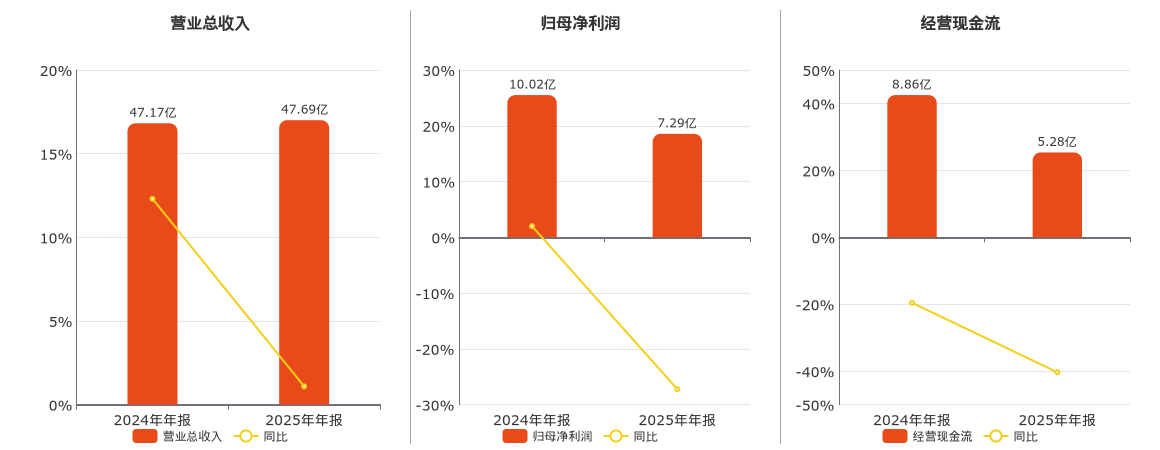 公司营业总收入为47.69亿元。归母净利润为7.29亿元,较去年同报告期归母净利润减少2.73亿元,同比较去年同期下降27.24%。经营活动现金净流入为5.28亿元,较去年同报告期经营活动现金净流入减少3.57亿元,同比较去年同期下降40.34%。