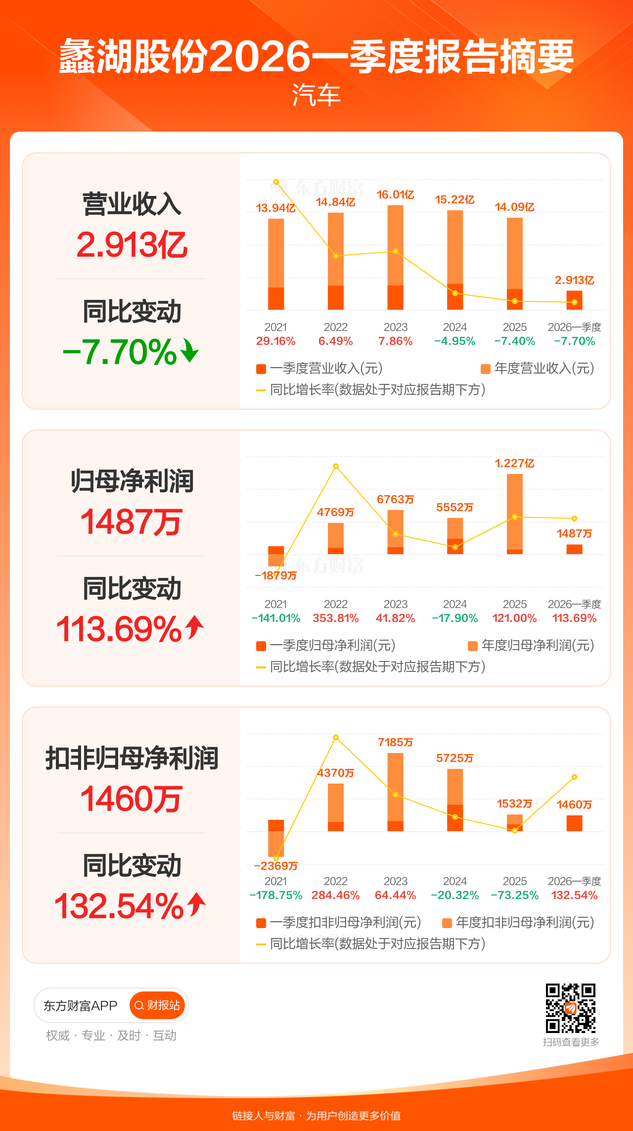 蠡湖股份4月22日发布2026年一季报显示,公司一季度实现营业收入2.91亿元,同比下滑7.70%;归母净利润1486.63万元,同比增长113.69%;扣非归母净利润1459.62万元,同比增长132.54%。
