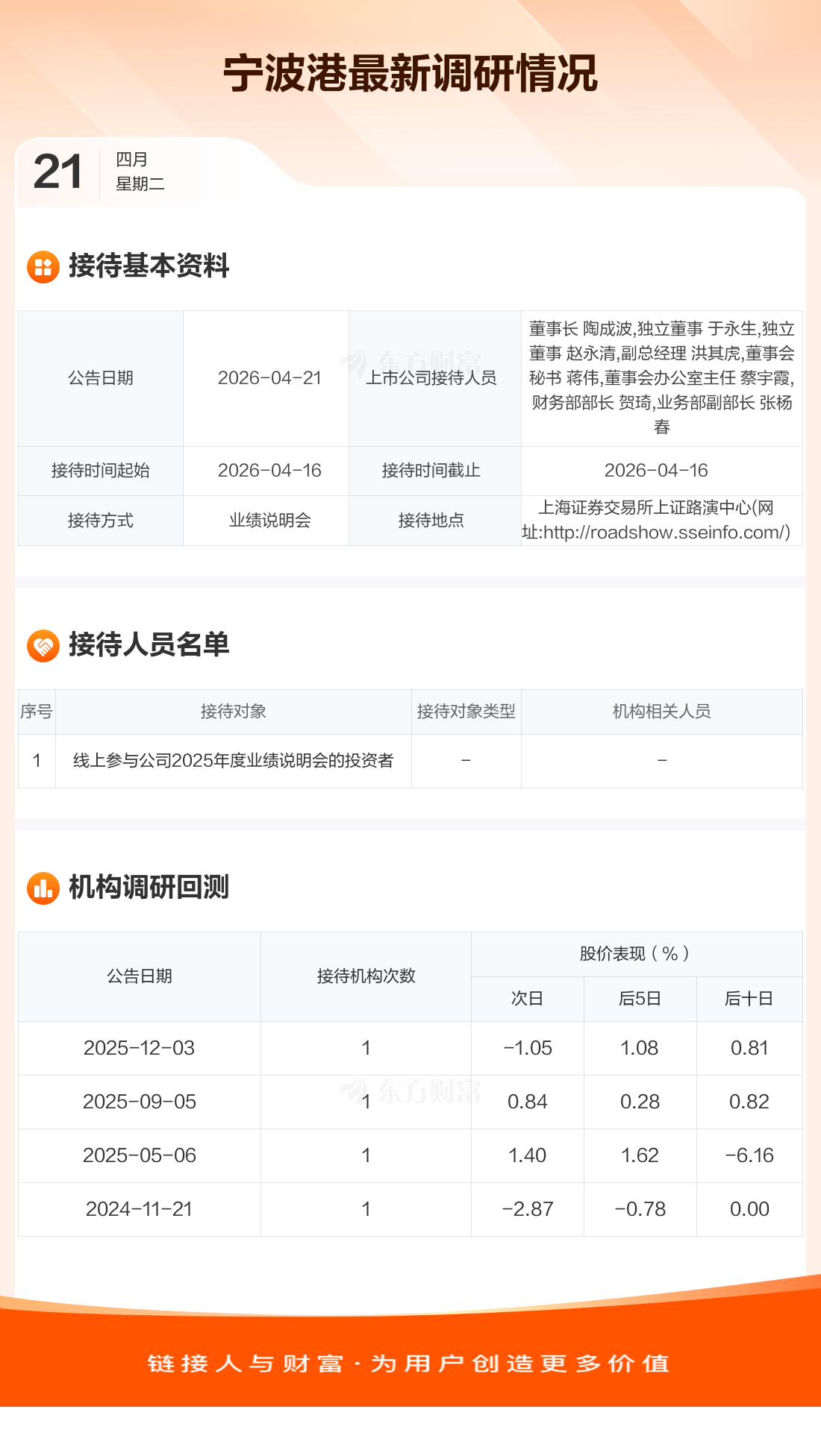 宁波港4月21日公告称,4月16日接待线上参与公司2025年度业绩说明会的投资者调研。接待人员包括董事长 陶成波,独立董事 于永生,独立董事 赵永清,副总经理 洪其虎,董事会秘书 蒋伟,董事会办公室主任 蔡宇霞,财务部部长 贺琦,业务部副部长 张杨春。