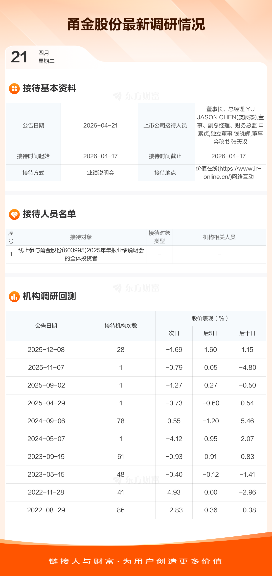 甬金股份4月21日公告称,4月17日接待线上参与甬金股份(603995)2025年年报业绩说明会的全体投资者调研。接待人员包括董事长、总经理 YU JASON CHEN(虞辰杰),董事、副总经理、财务总监 申素贞,独立董事 钱晓辉,董事会秘书 张天汉。
