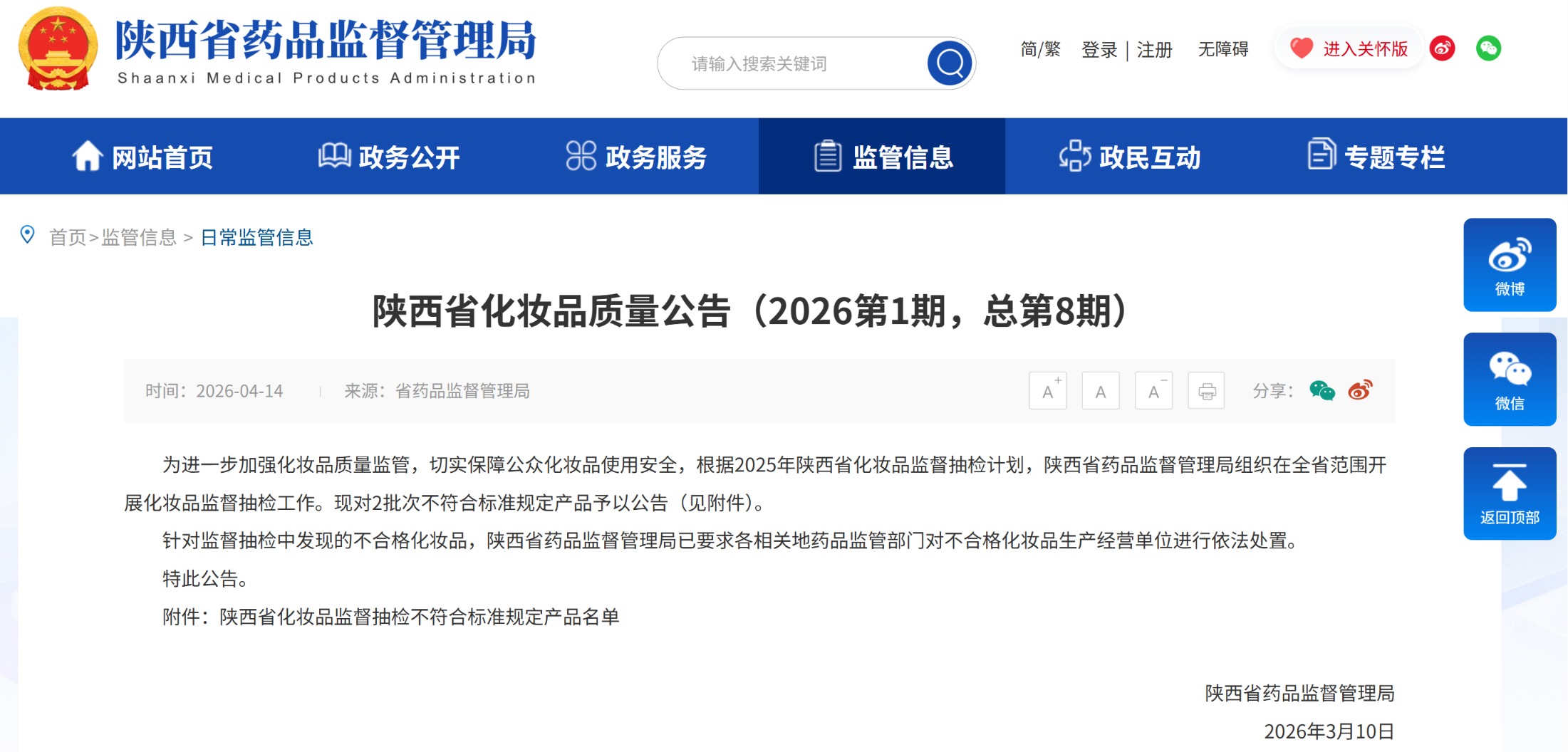 近日,陕西省药品监督管理局发布2026年第1期化妆品质量公告,公布了2批次不符合标准规定的化妆品。