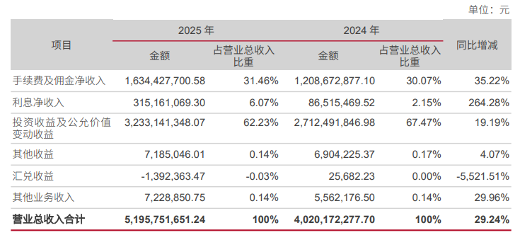 利息净收入2025年为3.15亿元,同比增加2.29亿元,增幅264.28%,占营收的6.07%,主要系其他债权投资利息收入增加及公司发行债券利息支出减少,资金运营效率显著改善。