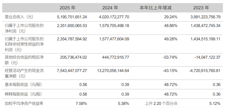 4月20日晚间,长城证券(002939)发布2025年年度报告,公司全年实现营业总收入51.96亿元,同比增长29.24%;归母净利润23.52亿元,同比增长48.86%。公司总资产规模为1349.9亿元,同比上升9.52%。