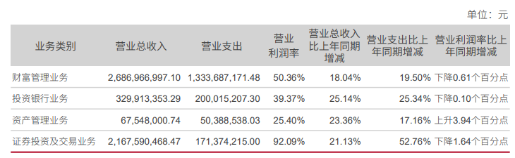 记者注意到,收入高增的背后,公司四大业务毛利率呈“三降一升”局面。财富管理贡献超半数营收,毛利率下滑0.61个百分点;证券投资及交易、投资银行业务,毛利率分别下滑1.64个百分点、0.10个百分点;仅占比1.3%的资管业务逆势提升3.94个百分点。