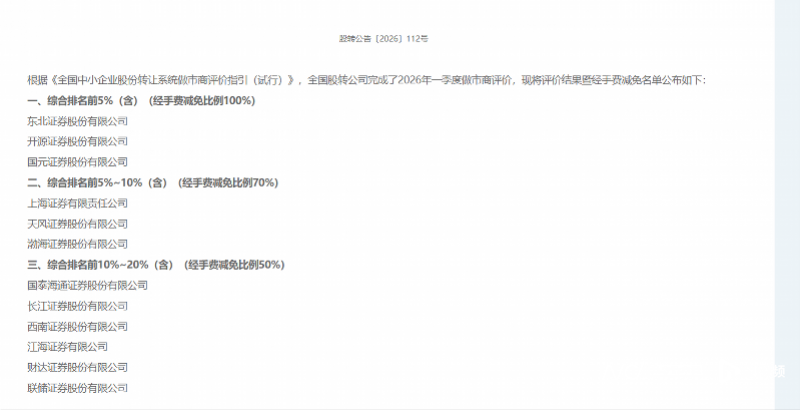 近日,全国股转公司发布了2026年一季度做市商评价结果,共12家做市商获得了做市交易经手费减免资格。具体而言,综合排名前5%的券商分别是东北证券、开源证券、国元证券,经手费减免比例为100%。综合排名在前5%—10%的也有3家券商,分别是上海证券、天风证券、渤海证券,经手费减免的比例是70%。综合排名在前10%—20%之间的有6家券商,经手费减免比例为50%,包括国泰海通证券、长江证券、西南证券、江海证券、财达证券以及联储证券。