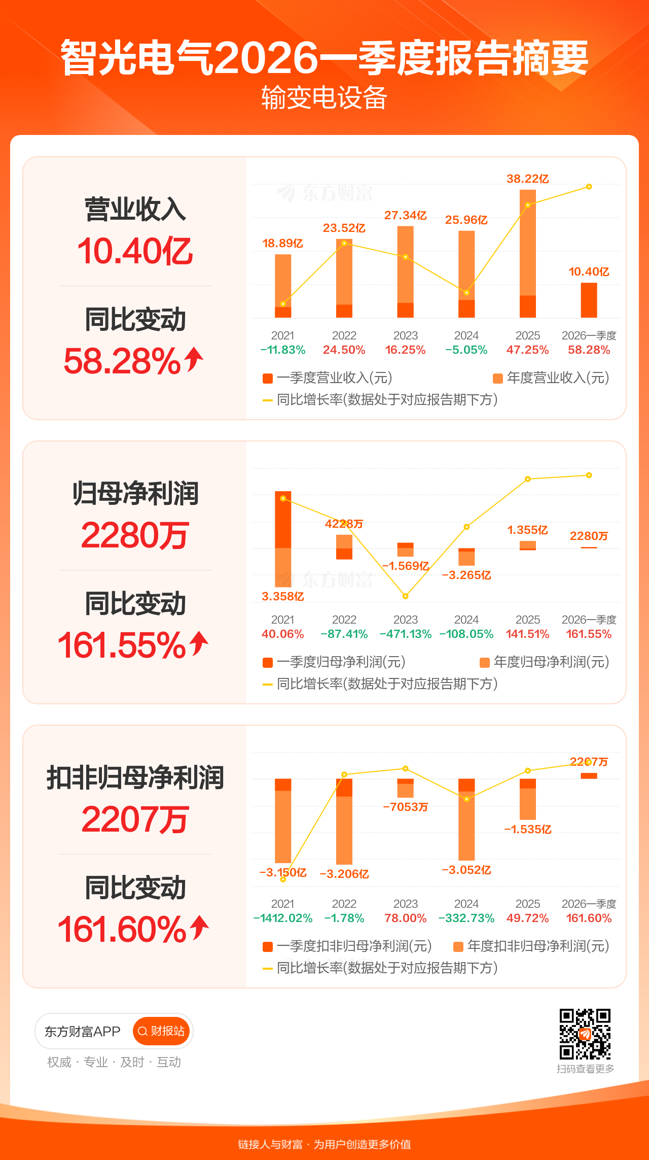 智光电气4月22日发布2026年一季报显示,公司一季度实现营业收入10.40亿元,同比增长58.28%;归母净利润2279.56万元,同比增长161.55%;扣非归母净利润2206.83万元,同比增长161.60%。