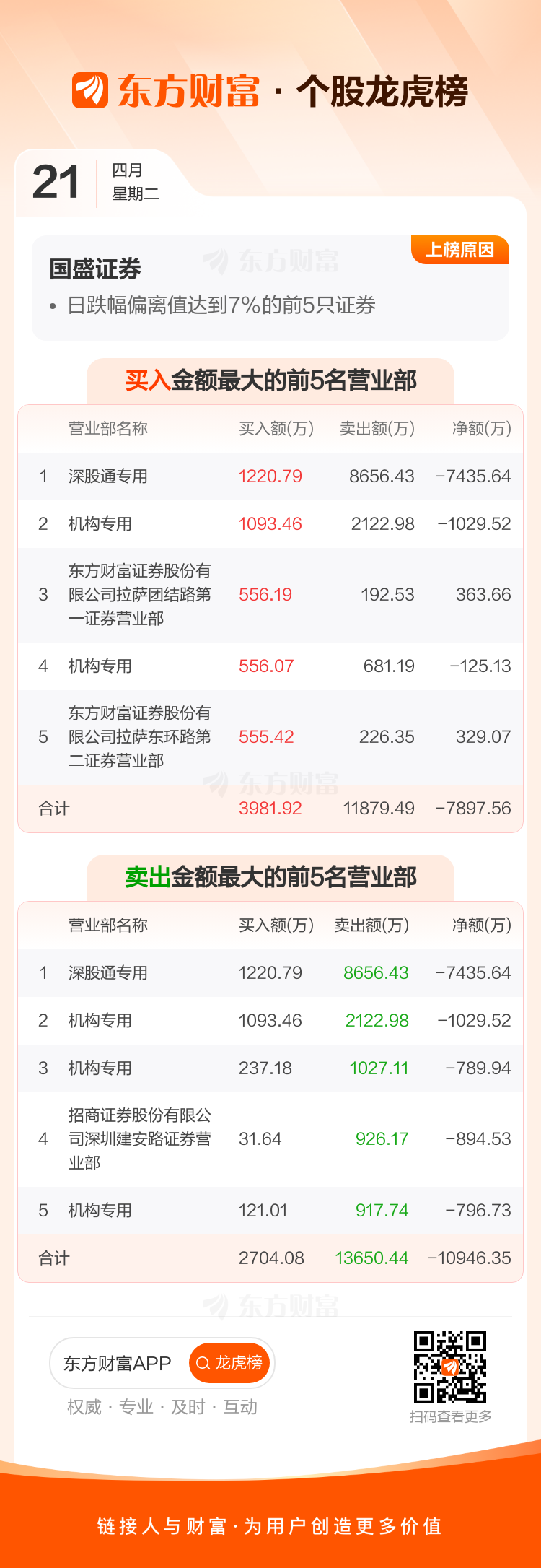 交易所2026年4月21日公布的交易公开信息显示,国盛证券因成为日跌幅偏离值达到7%的前5只证券上榜。国盛证券当日收报13.21元,涨跌幅-10.01%,偏离值-9.97%,换手率3.26%,成交额7.09亿。