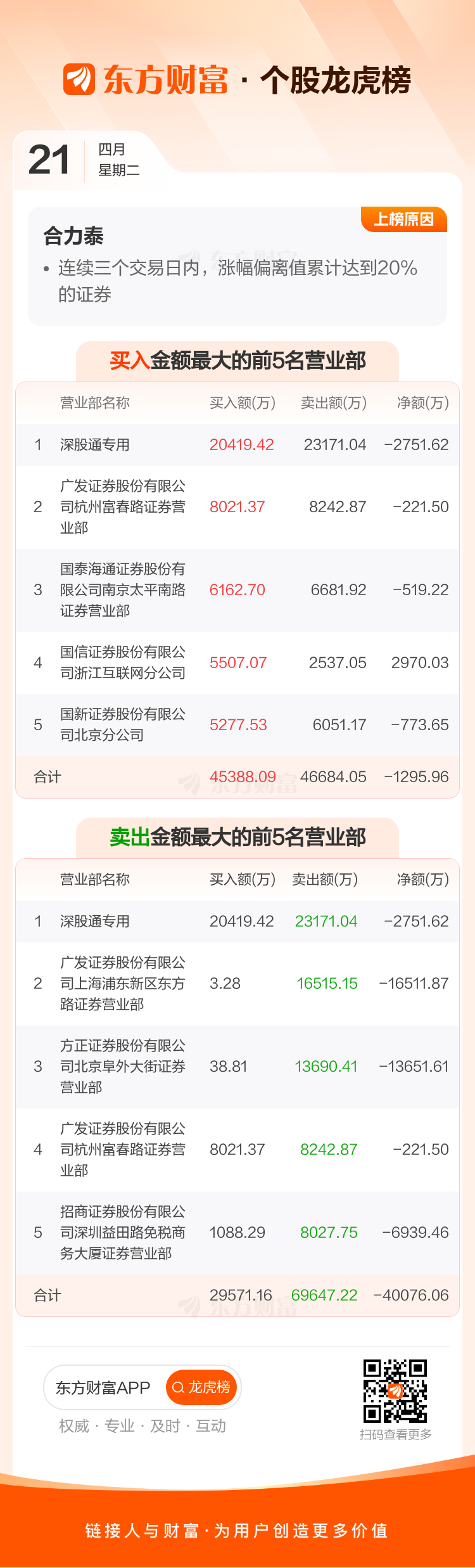 交易所2026年4月21日公布的交易公开信息显示,合力泰因成为连续三个交易日内,涨幅偏离值累计达到20%的证券上榜。合力泰当日收报2.98元,涨跌幅1.02%,换手率18.94%,成交额41.02亿。异常期间4月17日至4月21日,期间涨幅22.13%,累计偏离值21.11%,区间成交额61.58亿。