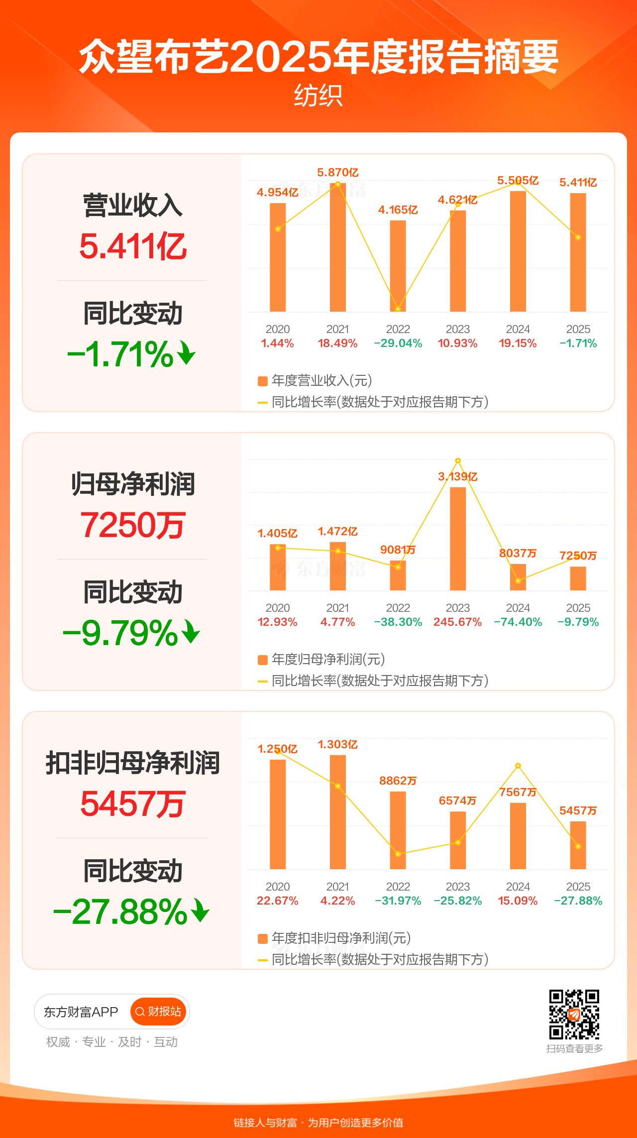 众望布艺4月22日发布2025年年报显示,公司全年实现营业收入5.41亿元,同比下滑1.71%;归母净利润7249.88万元,同比下滑9.79%;扣非归母净利润5457.19万元,同比下滑27.88%。