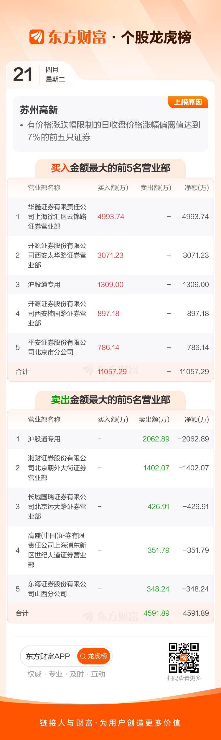 交易所2026年4月21日公布的交易公开信息显示,苏州高新因成为有价格涨跌幅限制的日收盘价格涨幅偏离值达到7%的前五只证券上榜。苏州高新当日收报6.92元,涨跌幅10.02%,偏离值9.94%,换手率4.30%,成交额3.33亿。