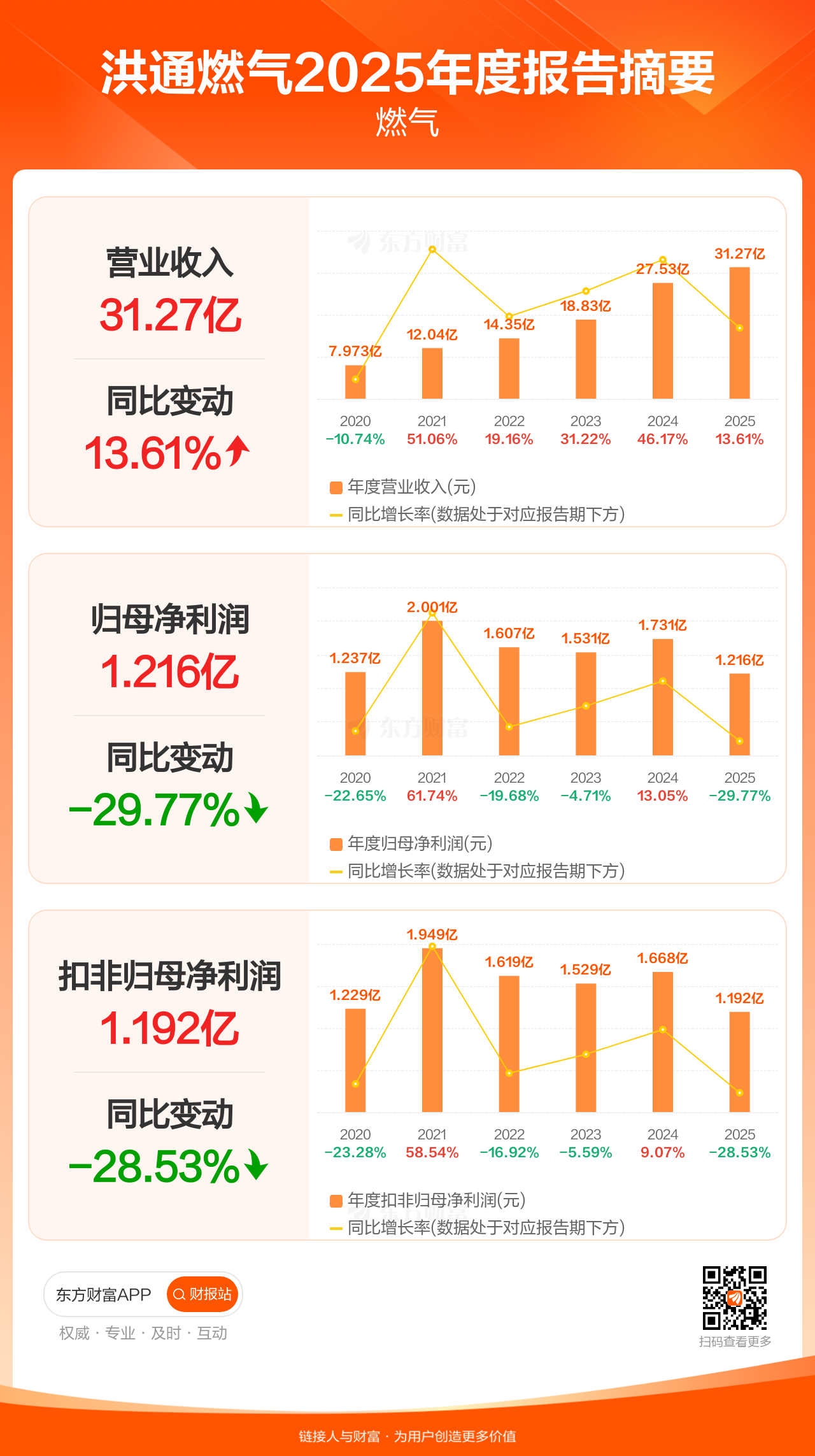洪通燃气4月22日发布2025年年报显示,公司全年实现营业收入31.27亿元,同比增长13.61%;归母净利润1.22亿元,同比下滑29.77%;扣非归母净利润1.19亿元,同比下滑28.53%。