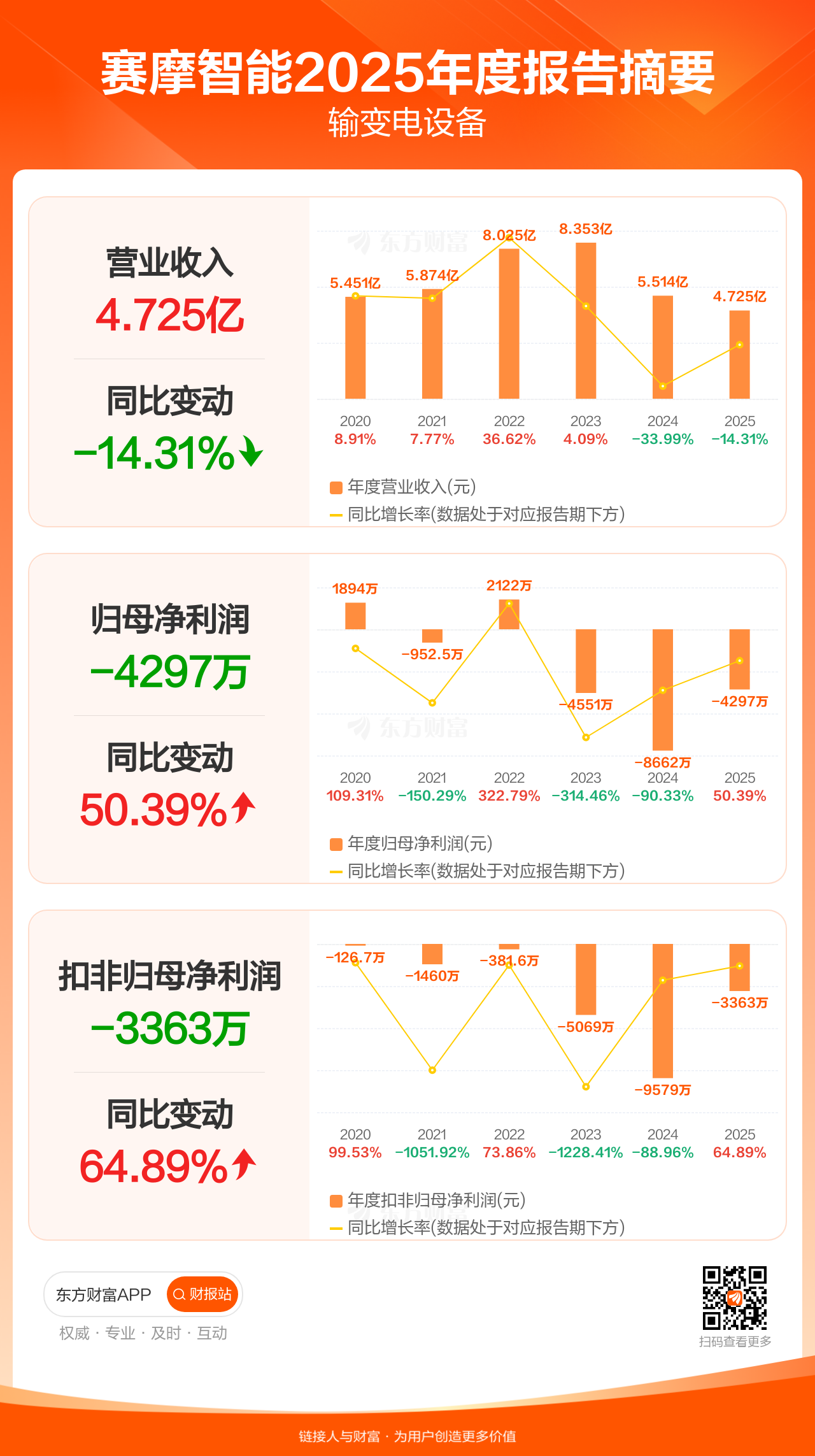 赛摩智能4月22日发布2025年年报显示,公司全年实现营业收入4.72亿元,同比下滑14.31%;归母净利润-4297.34万元;扣非归母净利润-3362.92万元。